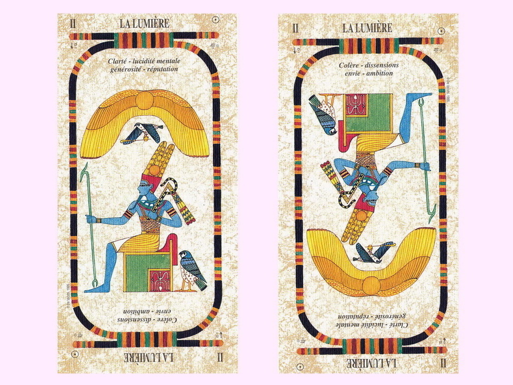 Sens de cet Arcane : C’est un Arcane aux tonalités solaires triomphantes : le Dieu Ré, assis sur son trône, est muni des insignes royaux tels que le sceptre, la pastorale et le fouet qui symbolisent à la fois un danger latent et la puissance. Dans son aspect trinitaire et dynamique, Ré représente le Soleil adule de midi. La Lumière, c’est également Khepri, le matin, le scarabée stercoraire, emblème de l’autorégénération ; c’est aussi Atoum, le soir, quand, sur sa barque solaire, il s’apprête à sillonner les eaux cosmiques pour s’enfoncer dans le douat, l’outre-tombe, d’ou il ne ressortira que le matin suivant, accueilli par un chœur de singes en liesse. Le disque ailé d’Aton surplombe la divinité Ré comme un baldaquin : c’est le Soleil sous son aspect physique, manifeste, que le pharaon Aménophis IV, sous le nom d’Akhénaton, célébra comme Dieu unique, pivot d’un monothéisme auquel l’esprit religieux égyptien de 1400 avant J.-C. n’était pas encore préparé. Le faucon perché à côté du trône est également solaire : c’est la représentation animale de Ré, ainsi que celle du prince Horus, Dieu du Ciel et vainqueur des ténèbres. Ce qui avait frappe les Egyptiens dans le faucon, prince des oiseaux par sa force et sa beauté, c’était la tache blanche bien visible qu’il porte sous son œil investigateur. Un œil auquel personne ne peut échapper, comme d’ailleurs rien n’échappe à celui franc et impitoyable du Soleil.