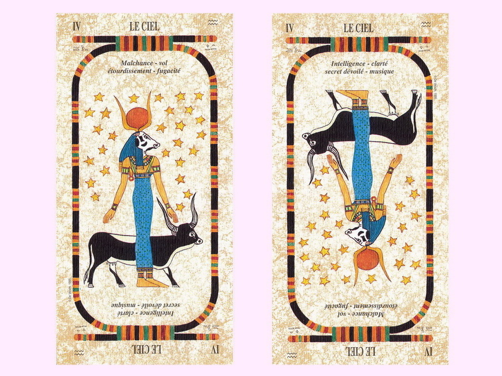 Un tirage de Yi-King ou de Tarot ne peut JAMAIS être négatif... Il ne fait qu'indiquer une pente montante, descendante ou plane. De la même manière que le passage d'un col est toujours précédé d'une montée et est toujours suivi d'une descente, avec des plats alternants entre, il en est ainsi de la Vie... Redescendre, c'est aussi avoir la possibilité de souffler un temps ou encore de prendre un élan conséquent. Vous devez également savoir qu'un Tarot n'a de sens que s'il est utilisé dans sa globalité par une personne qui en connait les subtilités. Les données qui suivent ne sont là que pour vous permettre de découvrir la spiritualité égyptienne. Surtout, n'en tirez aucune signification hâtive qui pourrait se révéler rapidement infondée...