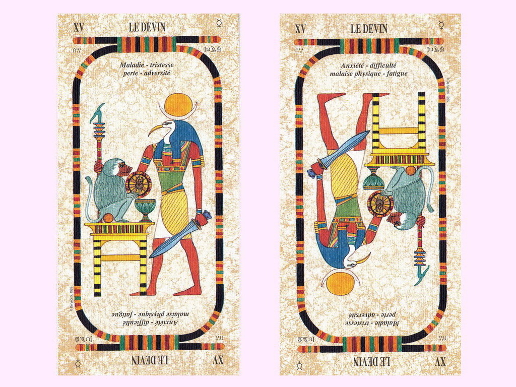 Sens de cet Arcane : La connexion très étroite avec la Lune, l’astre de la voyance et du rêve qu’il porte sur sa tête comme une couronne, fait du Dieu Thot, qui est également un mage, un guérisseur, un maitre d’initiation et un excellent devin. D’après les prêtres d`Hermopolis, les paroles sacrées qu’il prononça se transformèrent instantanément en quatre couples d’êtres divins, l’Ogdoade primordial. Thot a presque toujours été représenté sous l’apparence de l’ibis, qui lui était sacré. Il resta neutre par diplomatie dans la lutte titanesque que se livrèrent Horus et Seth et se contenta de jouer un rôle de médiateur. Toutefois, il n’hésita pas à prendre le parti de Nout quand celui-ci soutira à la Lune les cinq jours supplémentaires qui étaient nécessaires à la Déesse céleste et à son époux Geb, sévèrement séparés par Ré, pour concevoir leurs cinq enfants. En qualité de secrétaire des Dieux et de patron des scribes, il s’occupe de l’écriture, des langues, des annales et des lois, mais c’est également le Dieu qui fait les comptes, qui manipule les chiffres, qui établit le calendrier et ses fêtes. On le voit ici accompagné de son inséparable babouin, en train de manipuler les symboles des quatre éléments, le sceptre de la volonté, l’épée de l’audace et la coupe du savoir. Le quatrième instrument, la monnaie du silence, occupe forcément une position centrale, étant donné que le système de pensée égyptien faisait du silence la plus haute des vertus. Elle est donc placée entre les mains du singe, ennemi des ténèbres et partisan acharné du Soleil, qu’il salue chaque matin par des acclamations de joie.