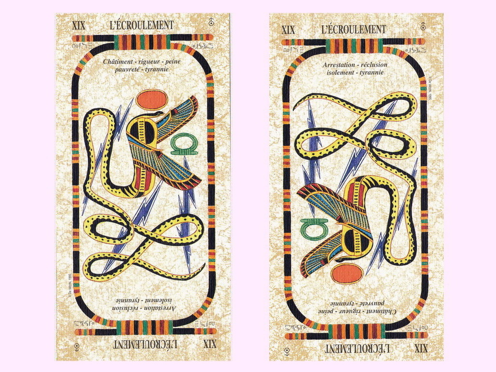Sens de cet Arcane : Dans le panthéon égyptien, le destructeur par excellence est le gigantesque serpent Apopis : c`est la quintessence des ténèbres et du mal qui, chaque matin et chaque soir, se dispute l’accès avec les forces de la Lumière et menace 1’ordre cosmique en attaquant la barque solaire de Ré. Pour aider au triomphe du Soleil, les prêtres prononçaient des formules d’exécration au moment où cet astre allait atteindre l’horizon, en jetant en même temps dans le feu, un simulacre en cire d’Apopis. Cependant, d’après le livre des Enfers, qui remonte à la dix-huitième dynastie, la rencontre décisive entre les deux survient à la septième heure du jour. Selon cette source, les arts occultes d`Isis sont nécessaires pour éviter que le monstre dévoreur ne prenne le dessus. Eternellement battu, Apopis renait cependant à chaque fois, pérenne, indestructible : c’est la contrepartie du bien, l’adversité nécessaire pour activer les forces d’équilibre qui soutiennent le Cosmos.